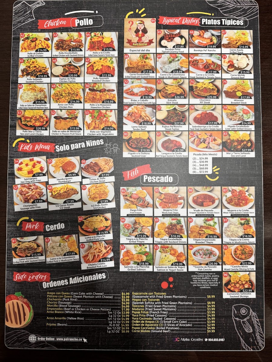 Pal' Rancho Iv, located at 1709 N Congress Ave, Boynton Beach, FL 33426, offers a delightful menu that showcases a rich variety of flavors from traditional Latin cuisine. Their Breakfast (Desayunos) menu provides hearty options perfect for starting the day. Try the Arepa Con Carne for a savory experience, or go for the Morcilla Con Arroz Y Huevos for a flavorful combination of blood sausage, rice, and eggs. The Calentado Con Chorizo Huevos Al Gusto offers a satisfying mix of chorizo, rice, and eggs, while the Calentado Con Arepa serves up a filling plate with a side of arepa, a staple in Latin American breakfasts.
